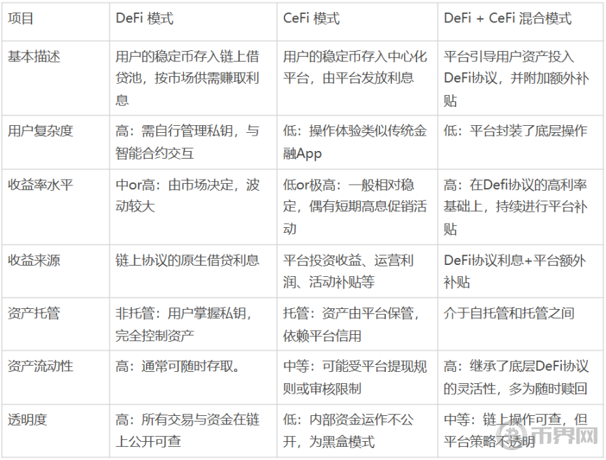 当前市场上的稳定币理财产品,依据其底层运作逻辑和资产托管方式,主要可分为三种模式:DeFi 原生模式、CeFi 托管模式,以及 DeFi 与 CeFi 相结合的混合模式。
