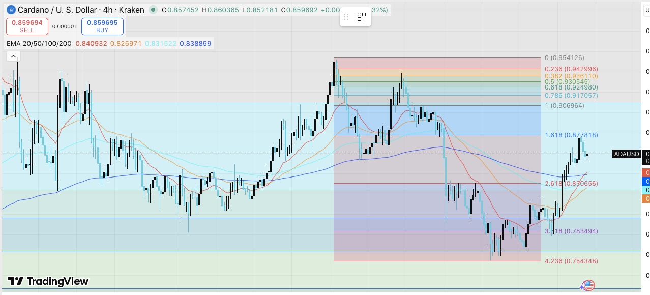 卡尔达诺(ADA)在大幅回调后进入复苏阶段,交易价格约为 0.86 美元。该加密货币从 0.75 美元至 0.78 美元的支撑位强劲反弹,展现出韧性。