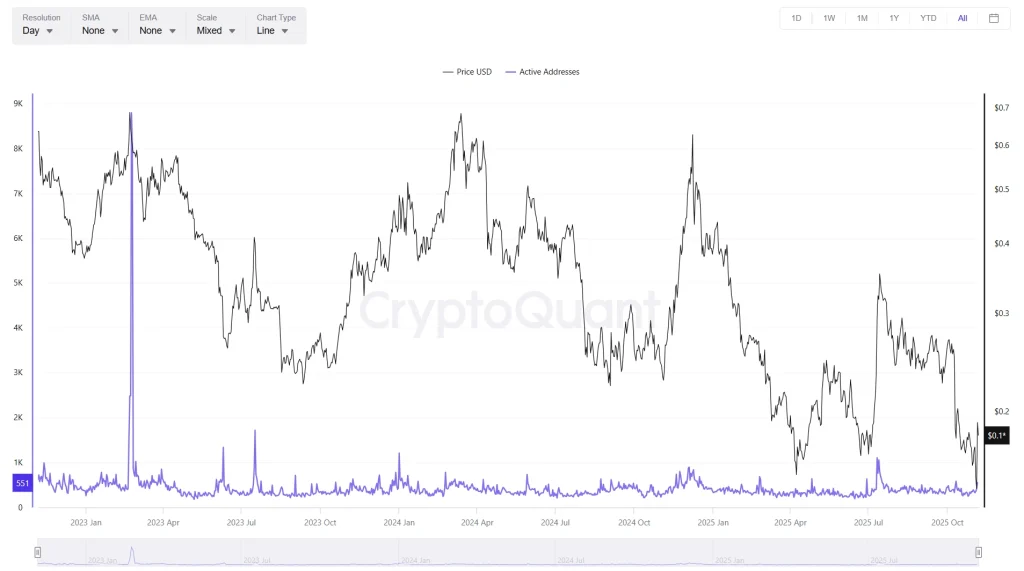 尽管近期价格波动,1英寸芯片的活跃地址数量一直保持相对稳定。数据来自加密量化数据显示,每日活跃地址基线约为 551 个,没有出现与价格波动直接相关的剧烈峰值或下降。