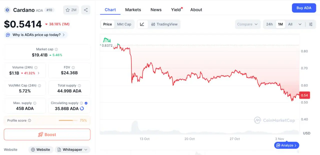 CoinCodex预测 Cardano 将在 12 月初上涨 32% 以上,接近 0.73 美元,但技术指标显示看跌,极端恐惧指数为 23。ADA 在过去 30 天中仅有 12 天上涨,波动率接近 11%,表明在任何持续上涨之前都会进行盘整。