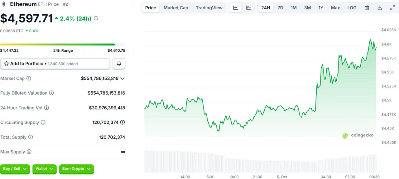 随着机构涌入,以太坊价格维持在 4,500 美元