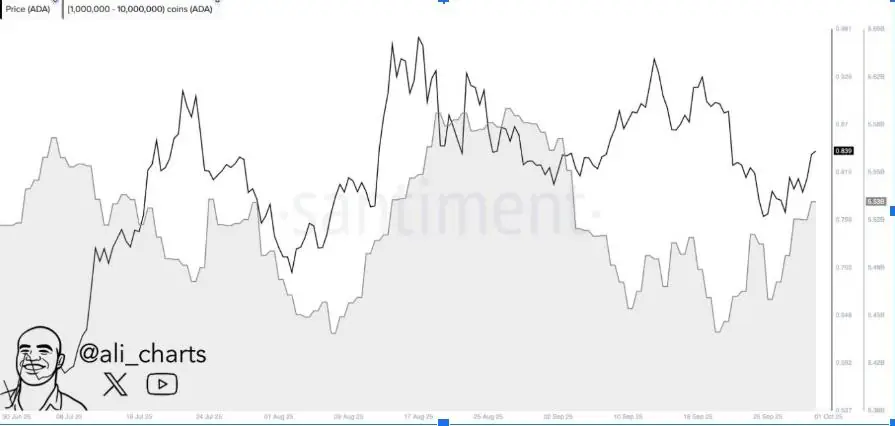 " >鲸鱼增持已恢复,大股东收购一周内 ADA 售出 7000 万枚,目前占总供应量的 15%。分析师认为这是一个强劲的看涨信号,并有可能在短期内推动 ADA 价格突破 1 美元。