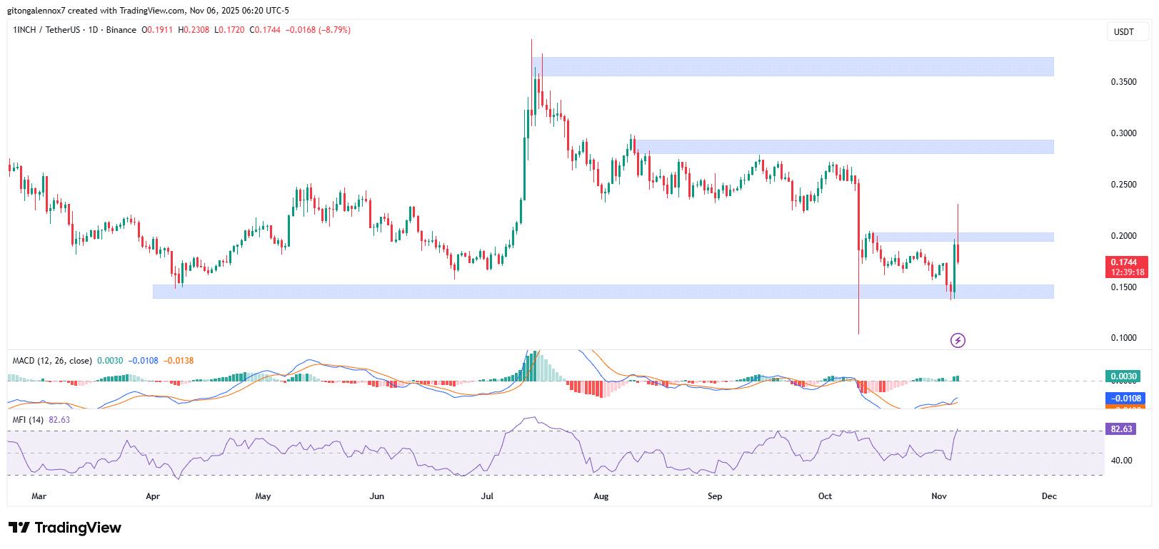 从图表上看,1INCH 的价格从 0.15 美元反弹并突破 0.20 美元,但这一走势并未持续。尽管如此,MACD 指标仍保持看涨态势。截至发稿时,资金流量指数 (MFI) 高于 82。