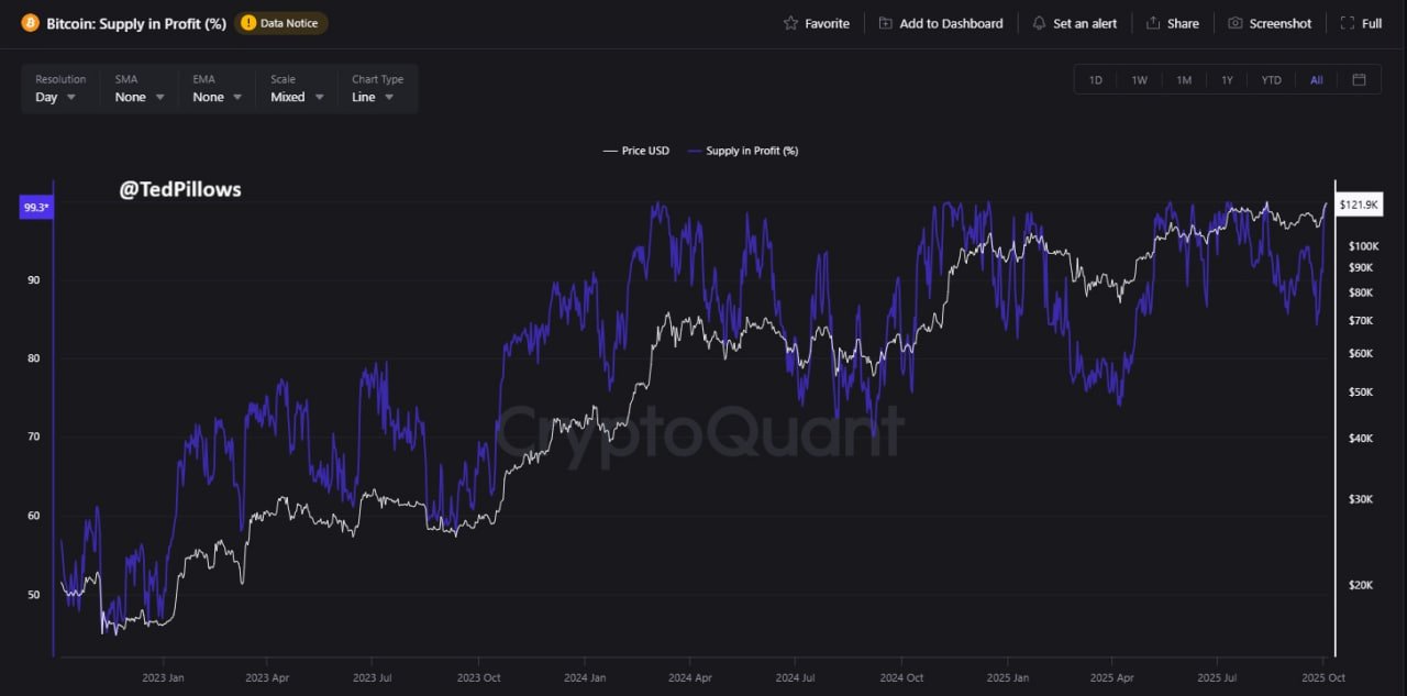 在一个X 帖子10月4日,市场分析师Ted Pillows分享了他对当前比特币市场的重要警示性见解。根据链上分析平台CryptoQuant的数据,继10月第一周比特币价格上涨之后,目前近99.3%的比特币供应量都处于盈利状态。