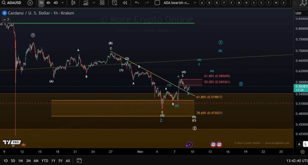 要确认11月4日的底部是否有效,ADA需要突破周六0.59美元的高点。如果跌破0.516美元,则可能预示着白色形态内还有一轮下跌。