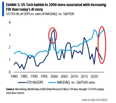 资本流向不同:2000年伴随着外国直接投资(FDI)占GDP比重的大幅飙升;而本轮AI热潮中,FDI的增长规模远不及当年。