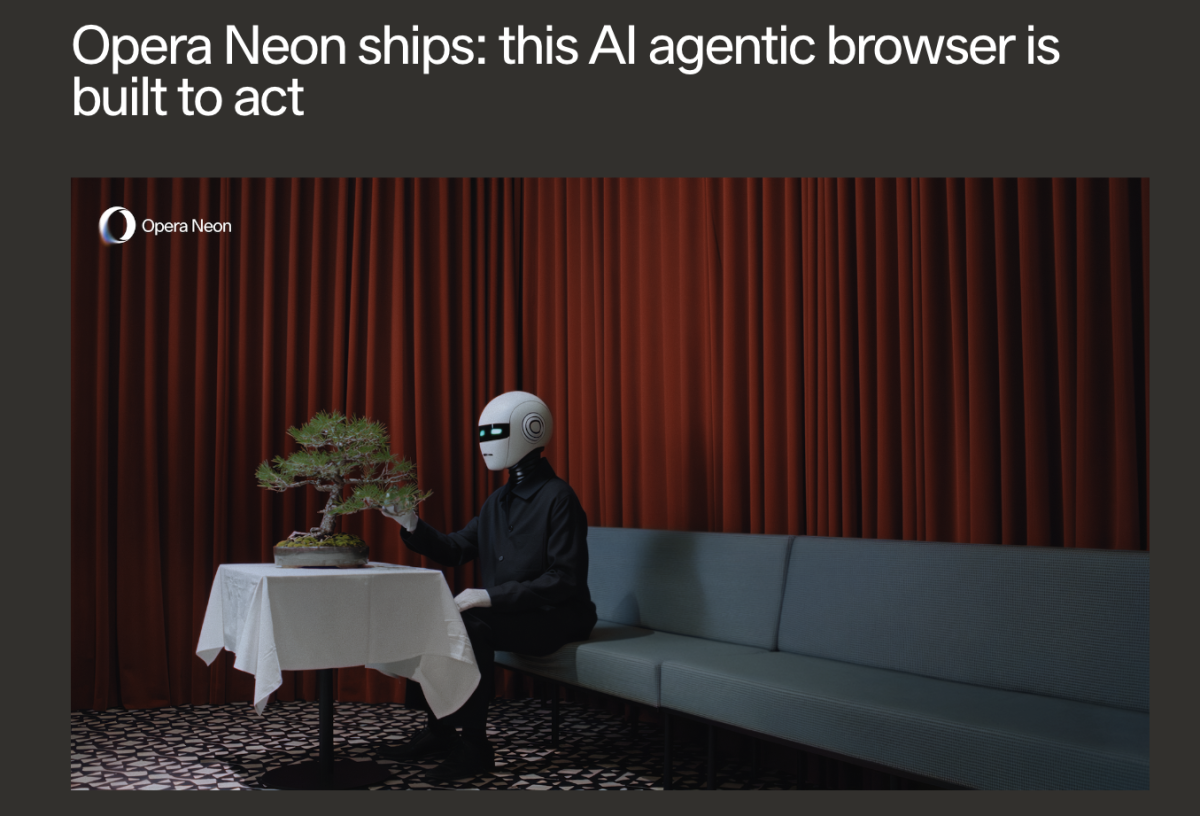 ①Opera周二正式推出智能代理浏览器Neon,支持用户通过预设提示词实现表单填写、跨站数据比对、自动退订等复杂任务自动化;②新品暂向受邀用户开放,月费19.99美元,直面谷歌、OpenAI、Perplexity等巨头在AI代理赛道的竞争。