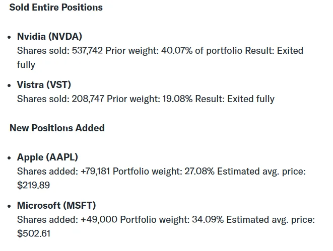 超过53.7万股,约占其投资组合的40%的英伟达股票持仓,从最新的13F报告中消失了,2024年以来美国电力股热潮的最大赢家—— $Vistra Energy (VST.US)$ 也被该对冲基金完全清仓,此前曾经占其投资组合的19%。