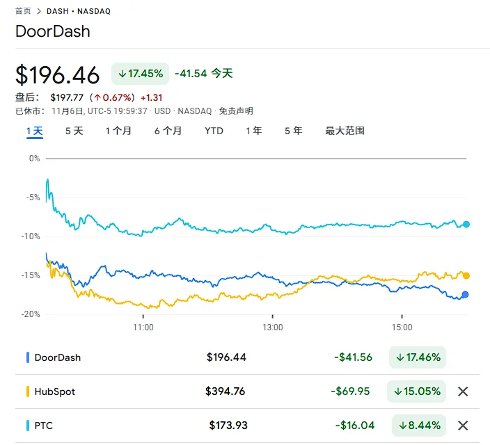 从个股表现看,DoorDash下跌15%,HubSpot下跌17%,PTC下跌10%。此前Meta下跌12%,Netflix下跌10%,Arista Network下跌9%,PLTR下跌7%,MSFT持续走弱。