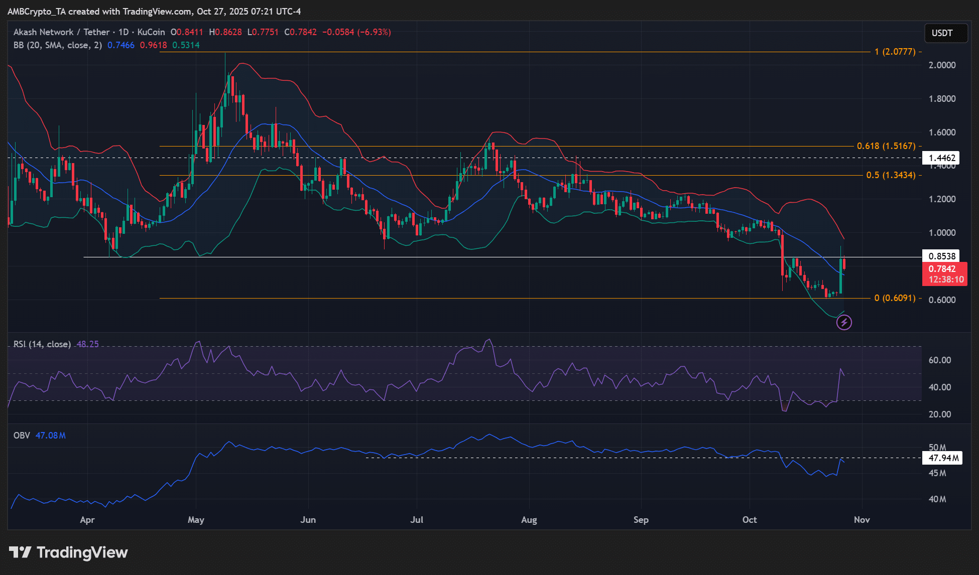 与大盘复苏一样,Akash Network 的原生代币AKT周末出现大幅上涨。比特币[BTC]收回 11.5 万美元,10 月 26 日 AKT 上涨 31%。