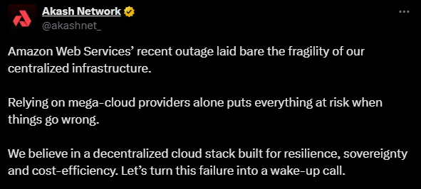 作为 Web3 领域的替代去中心化云提供商,Akash 网络仍然在线。事实上,该协议用过的此次停电事件被标榜为解决此类单点故障的解决方案。