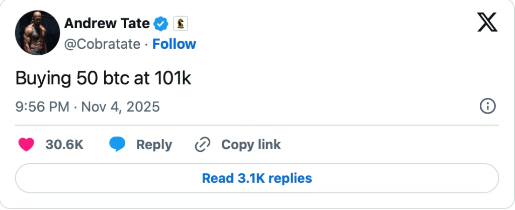 上个月,颇具争议的网络红人安德鲁·泰特(Andrew Tate)预测比特币将暴跌至2.6万美元,市场严阵以待。然而剧情反转:区块链分析揭示了截然不同的景象:在公开预测熊市的同时,泰特的钱包却以折扣价积累了超过500万美元的比特币。