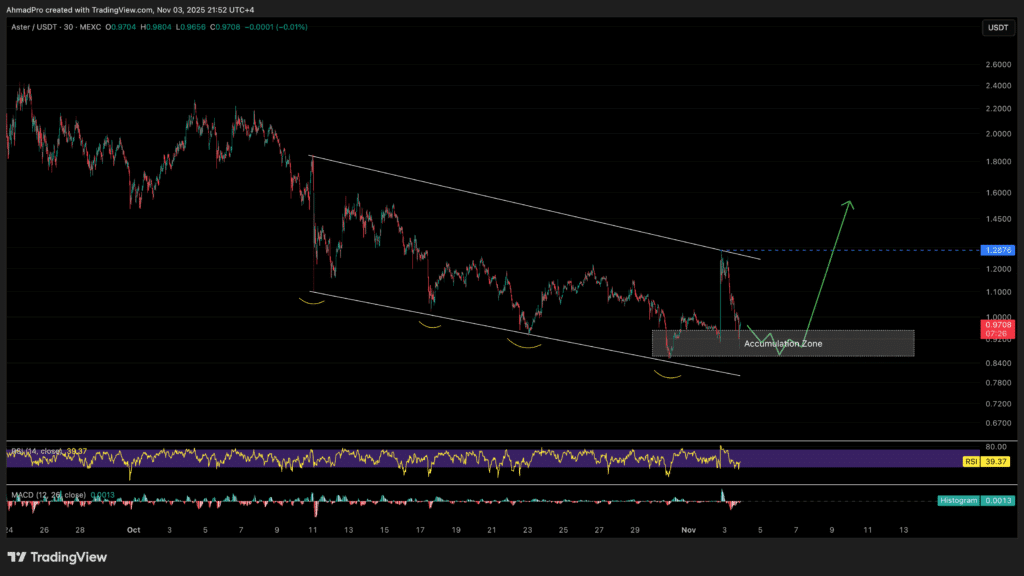 Aster 目前位于 0.90 附近的累积区域内,该区域此前曾多次形成强劲的底部形态。图表显示出清晰的下降通道形态,价格正在再次测试下边界,并形成多个圆弧形低点,这表明卖方力量正在减弱。