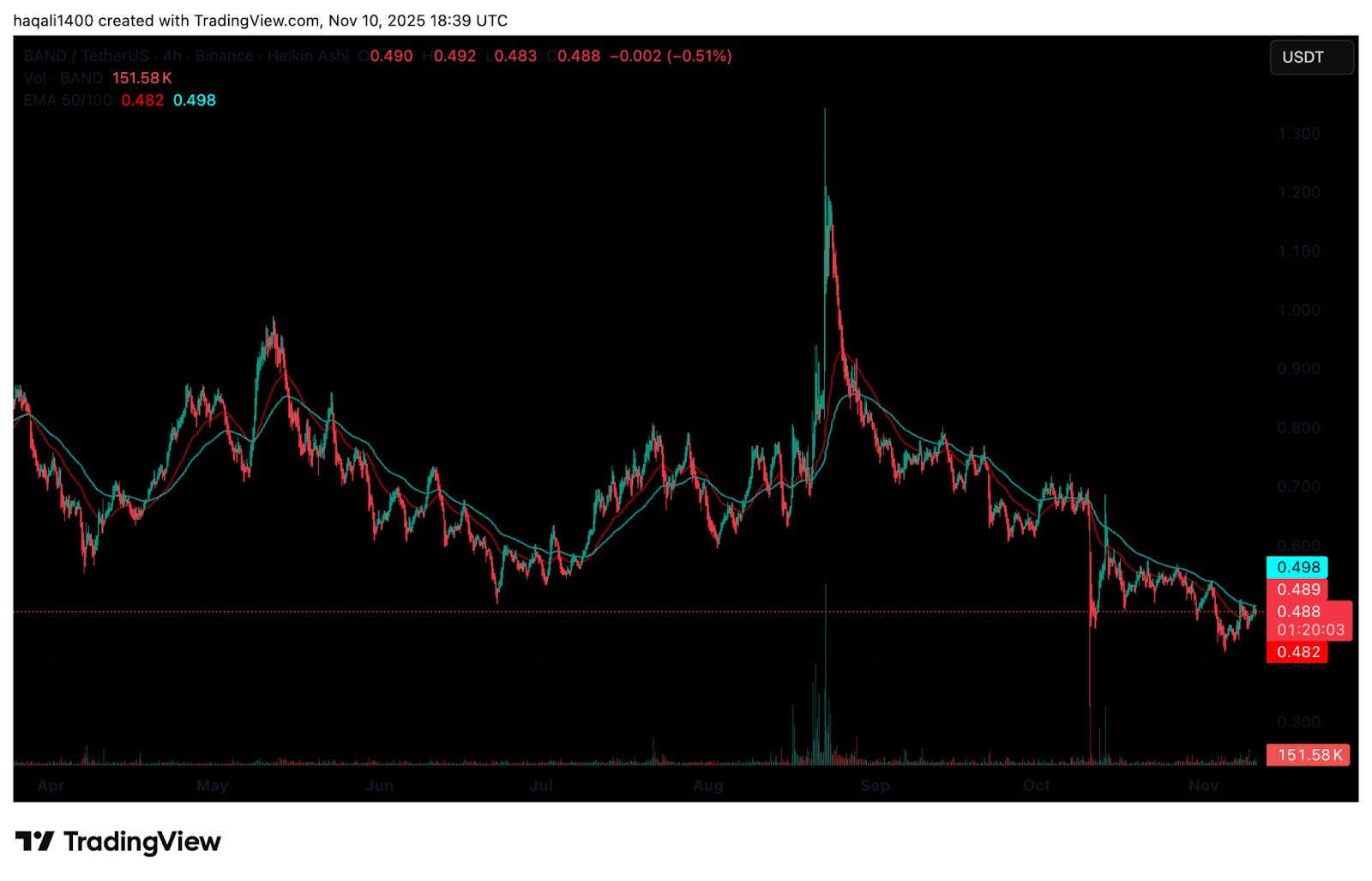在 TradingView 的 4 小时图表上,BAND 的价格继续呈下跌趋势。目前价格接近 0.488 美元,100 日均线位于 0.498 美元附近,构成支撑位。