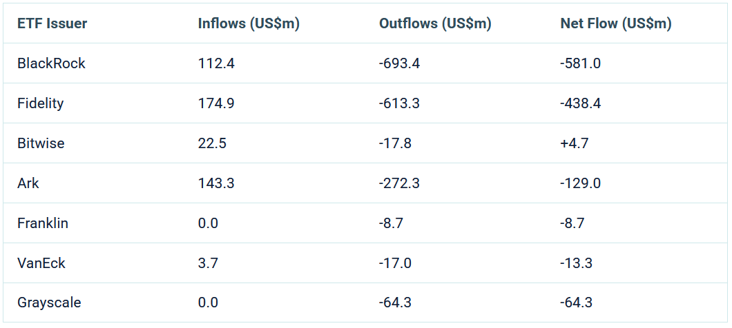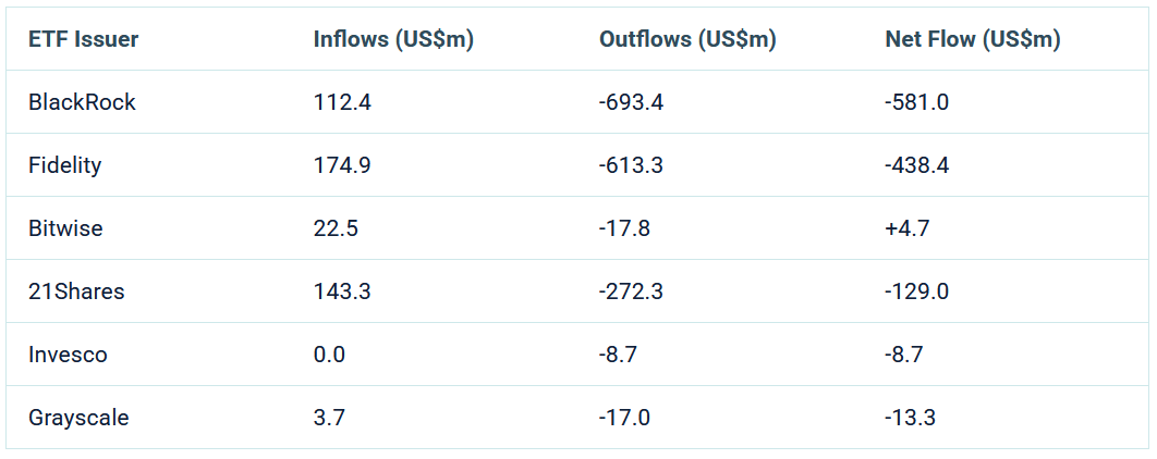 在经历了创纪录的 10 月份之后,11 月的第一周加密货币 ETF 发行商的形势发生了逆转。数据来自Farside Investors这表明,包括全球最大的资产管理公司在内的贝莱德和富达他们的比特币 (BTC) 和以太坊 (ETH) 基金遭遇了大量赎回,抹去了上个月的部分收益。