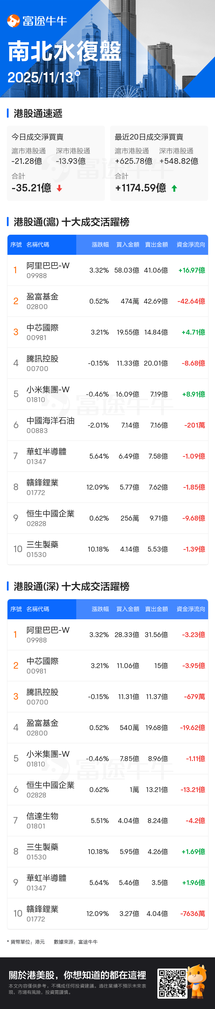 11月13日(周四),南下资金今日净卖出港股35.21亿港元。