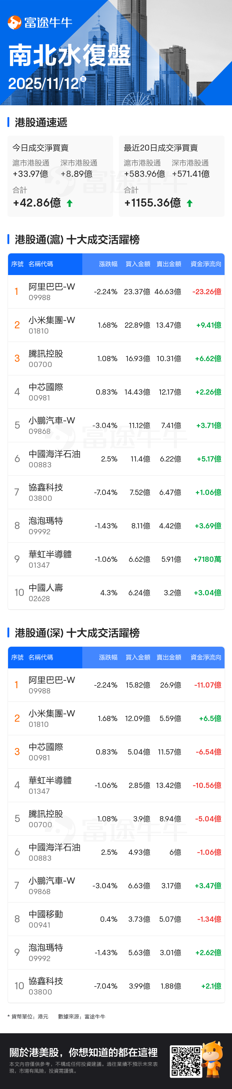 11月12日(周三),南下资金今日净买入港股42.86亿港元。