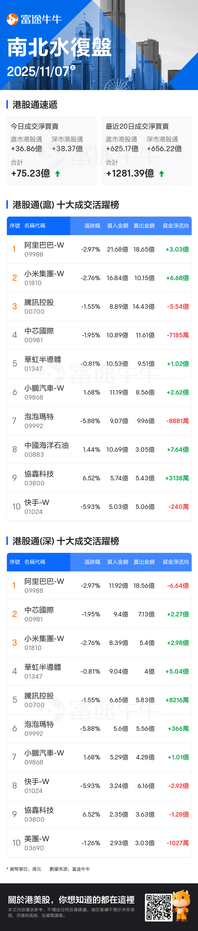 11月7日(周五),南下资金今日净买入港股75.23亿港元。