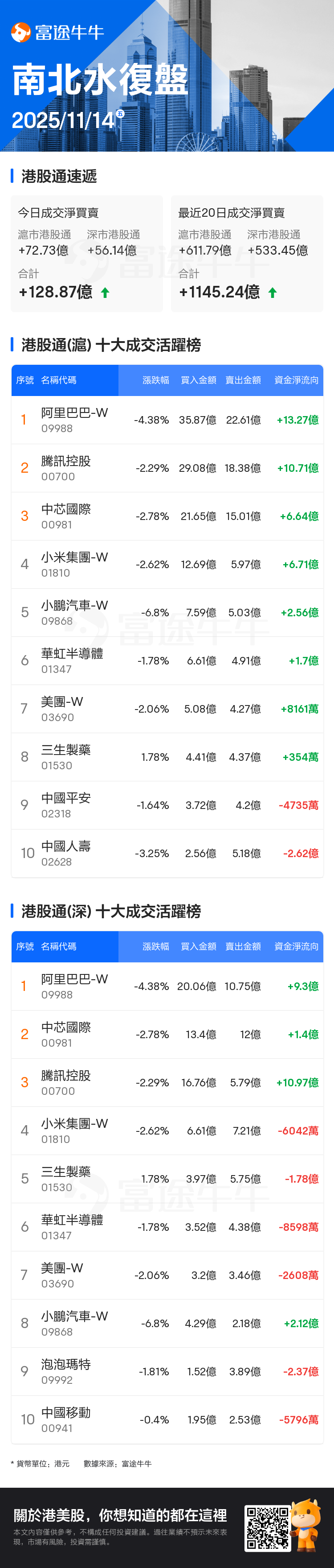 11月14日(周五),南下资金今日净买入港股128.87亿港元。