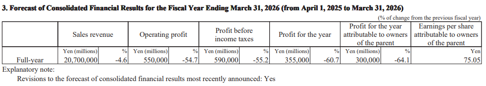 截至2025 年9月30日的六个月期间,其盈利也大幅下滑,原因是全球需求疲软以及成本上升对利润造成了影响。该公司归属于母公司所有者的综合利润同比下降37%,至 3118 亿日元(约合 20.3 亿美元)。该期间的每股摊薄盈利为 76.30日元人民币,较上年同期的 103.25日元大幅下降。营业利润同比下降 41%至 4381 亿日元,这反映了原材料成本上升以及主要出口市场复苏缓慢所带来的压力。