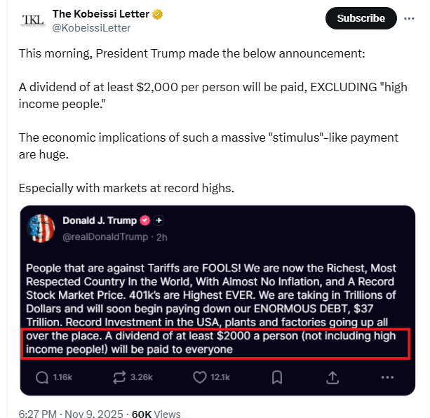 大规模刺激计划的消息已经推高了加密货币价格。特朗普的承诺2000美元的“关税红利”将惠及大多数美国人,总额约为4000亿美元。