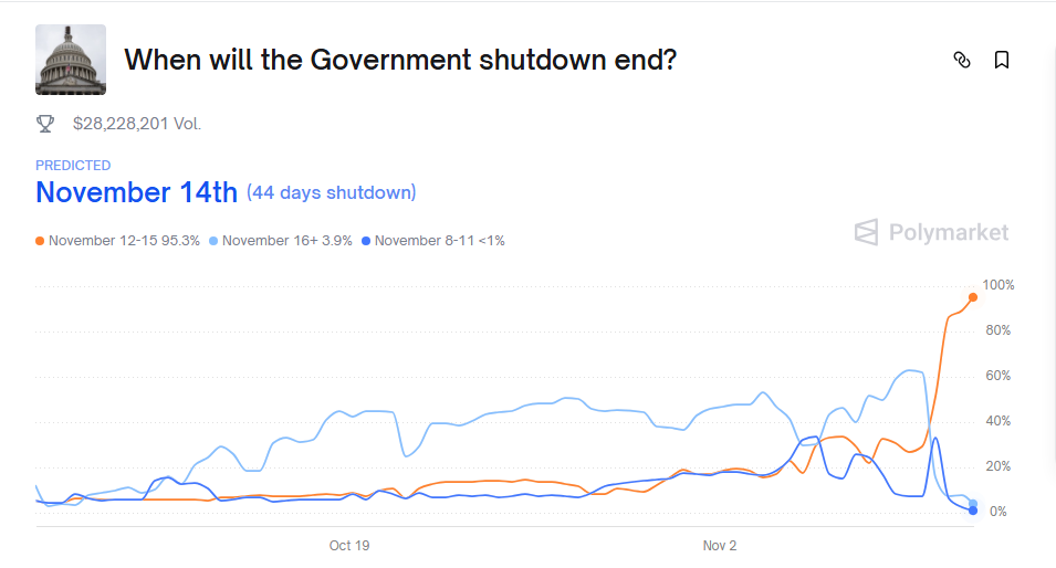 事实上,Polymarket赔率认为停摆将于 11 月中旬结束的人数约为 87%,这表明交易员预计流动性很快就会得到提升。