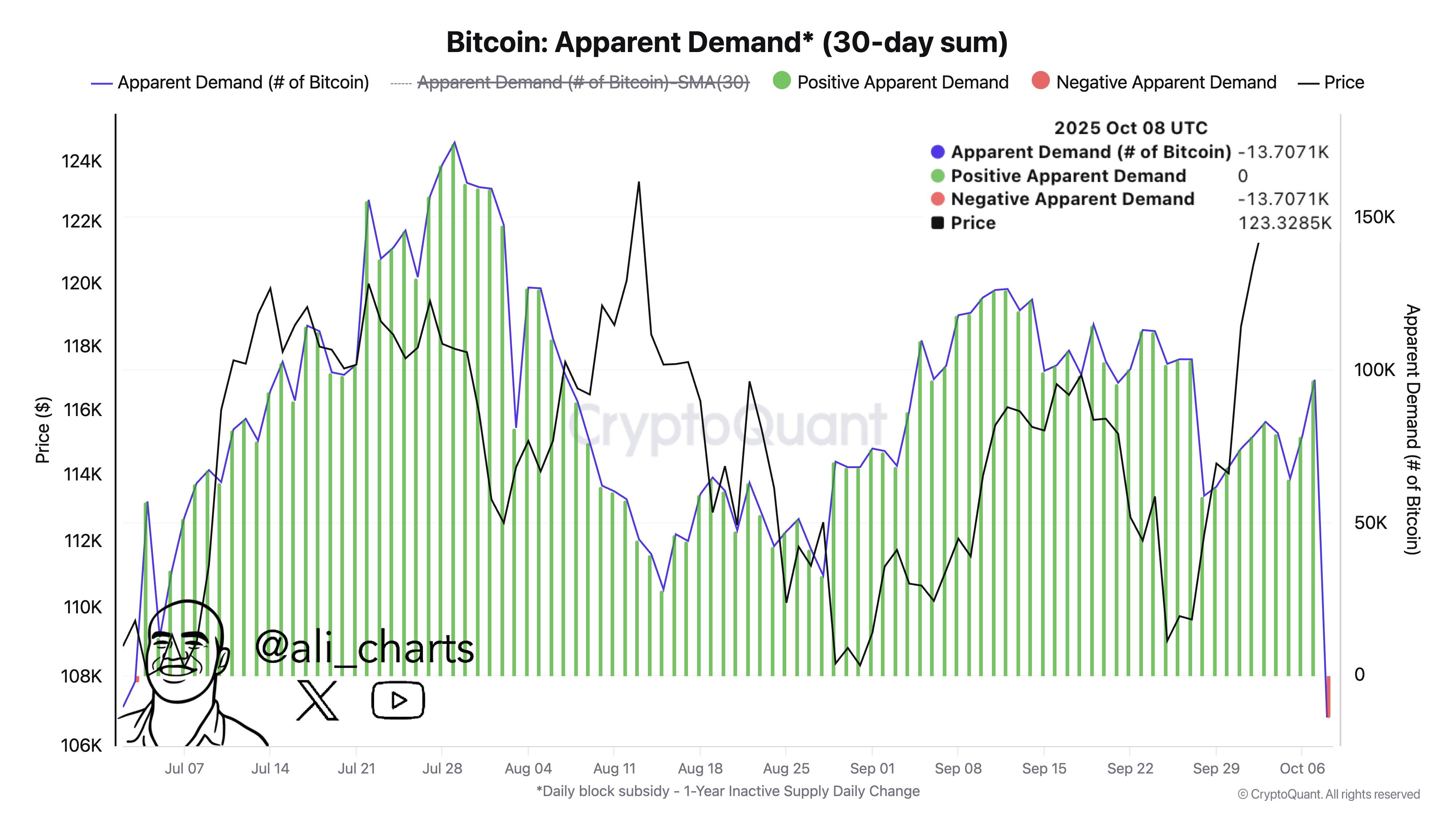 在一个X 帖子10 月 11 日,著名市场分析师 Ali Martinez 分享的链上数据显示,比特币的明显需求最近三个月来首次转为负值,表明投资者的兴趣在短期内有所降温。