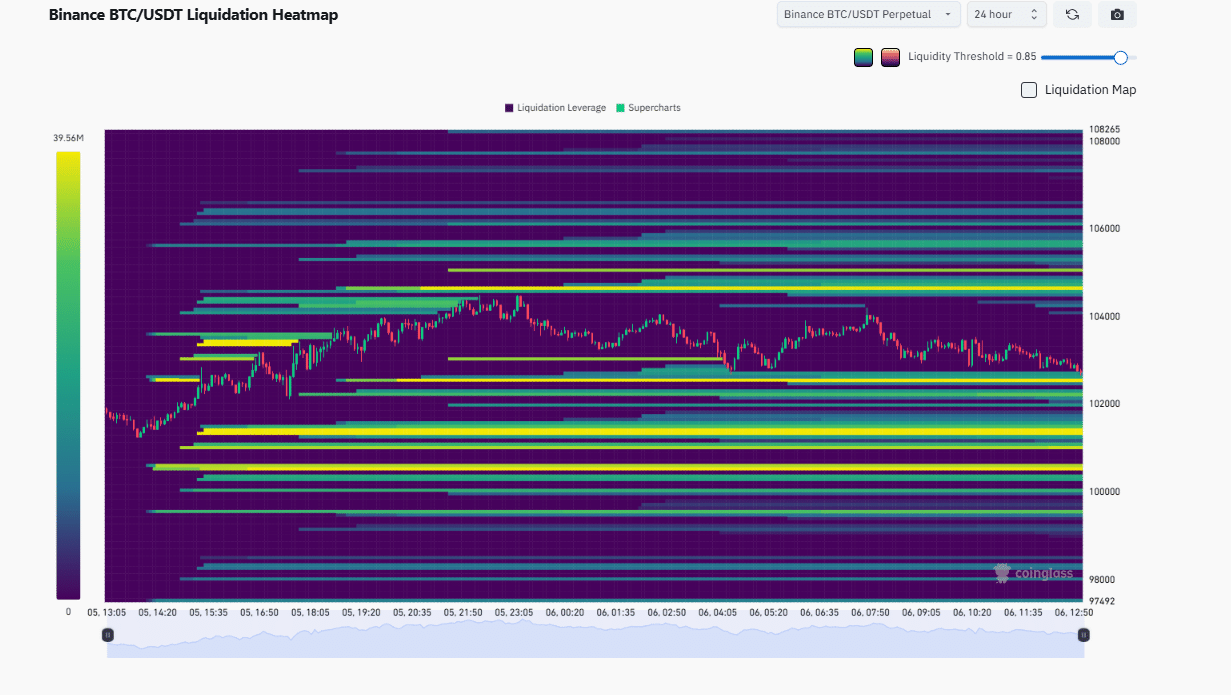 截至发稿时,BTC/USD 价格热力图显示,在 104,600 美元附近有大量卖出限价单。
