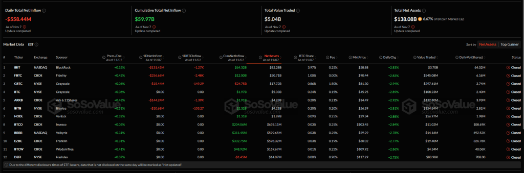 专注于比特币的 ETF 录得自 8 月以来最大的单日资金流出,在比特币价格徘徊在 102,000 美元附近时,共计 5.58 亿美元资金从市场流出。数据SoSoValue 的数据显示,这一举动导致一些大型基金当日亏损,并发出新的信号,表明交易员在近期上涨后正在进行再平衡。