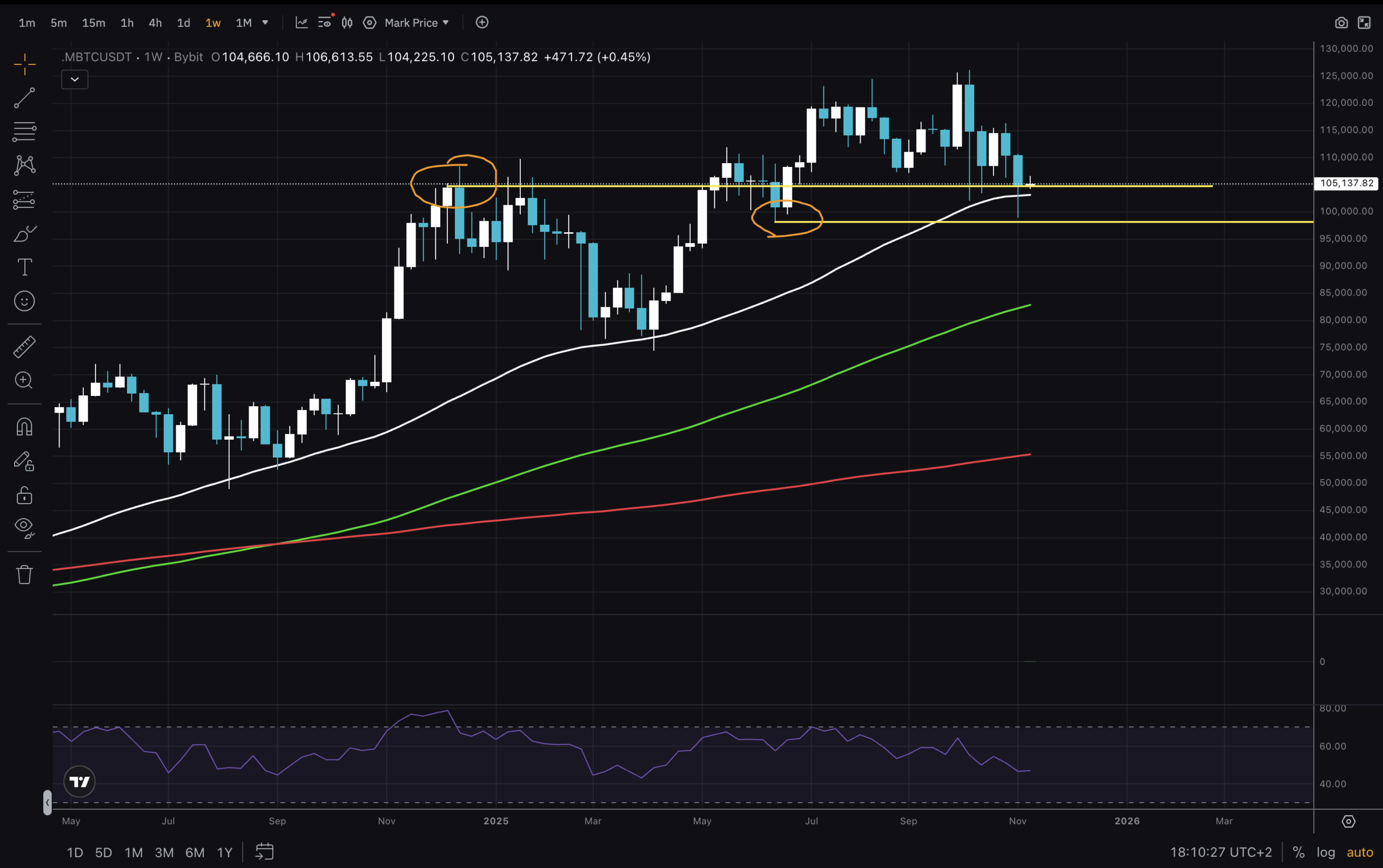 从周线图开始分析,我们可以看到市场当前的交易环境。比特币价格目前位于50日均线支撑位附近,该均线在过去一年半中曾两次触及低点。此外,比特币价格目前在2024年第四季度周线收盘高点和2025年春季低点所构成的区域内波动。这个位于97,700美元至105,000美元的需求区域目前起到支撑作用。