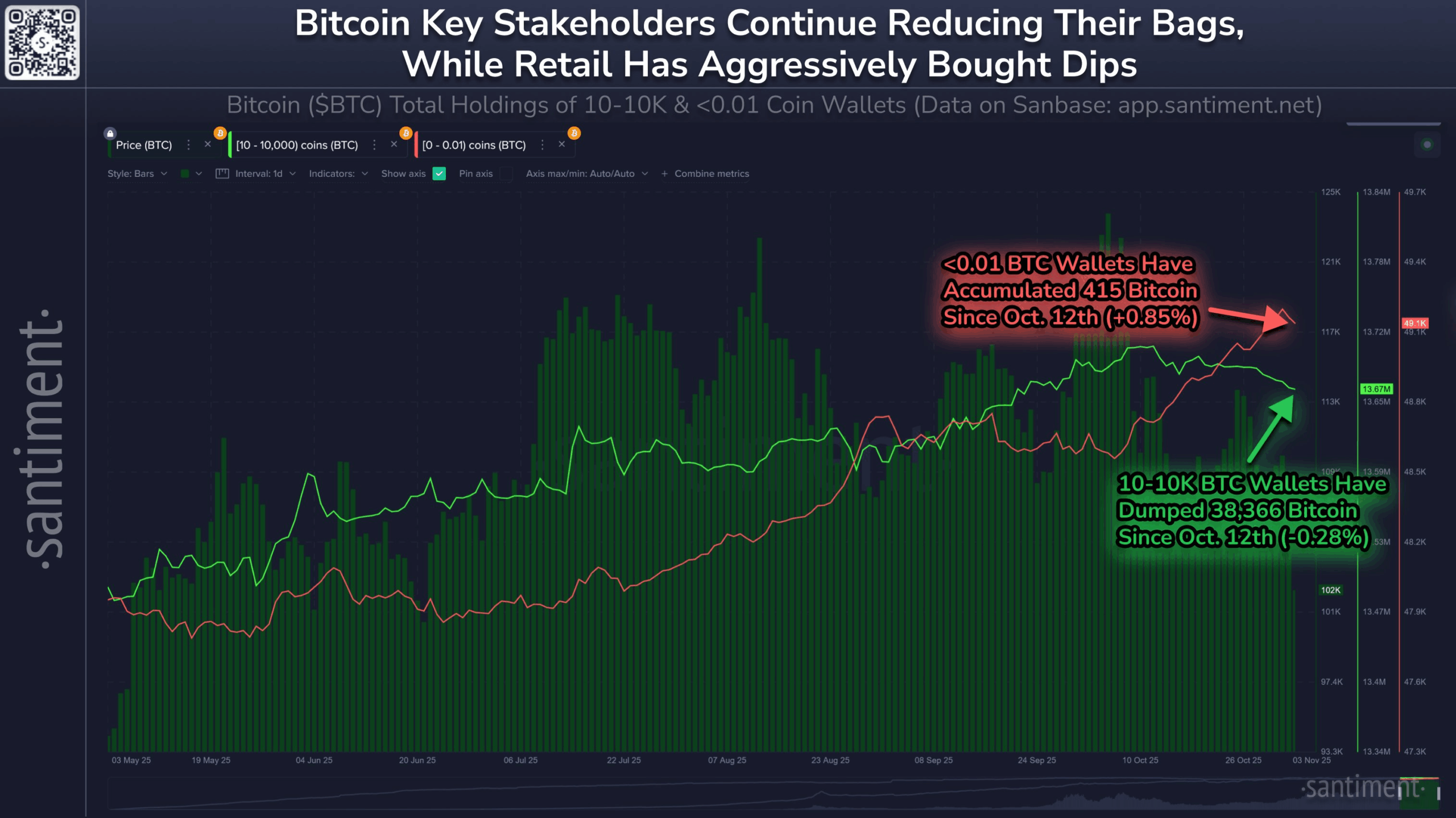 专家表示,比特币价格要想反弹,这种趋势需要逆转,即巨鲸和鲨鱼大量买入比特币,而小投资者则抛售。