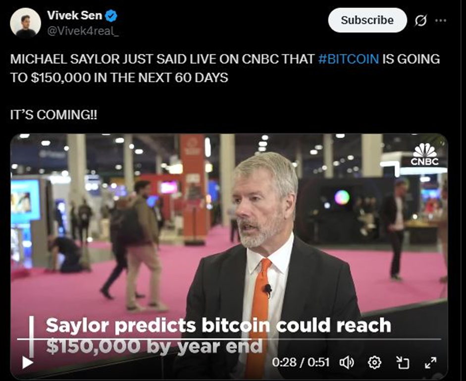 他在最近的一次采访中提到,他预计比特币价格预计到年底将反弹至 15 万美元以上。