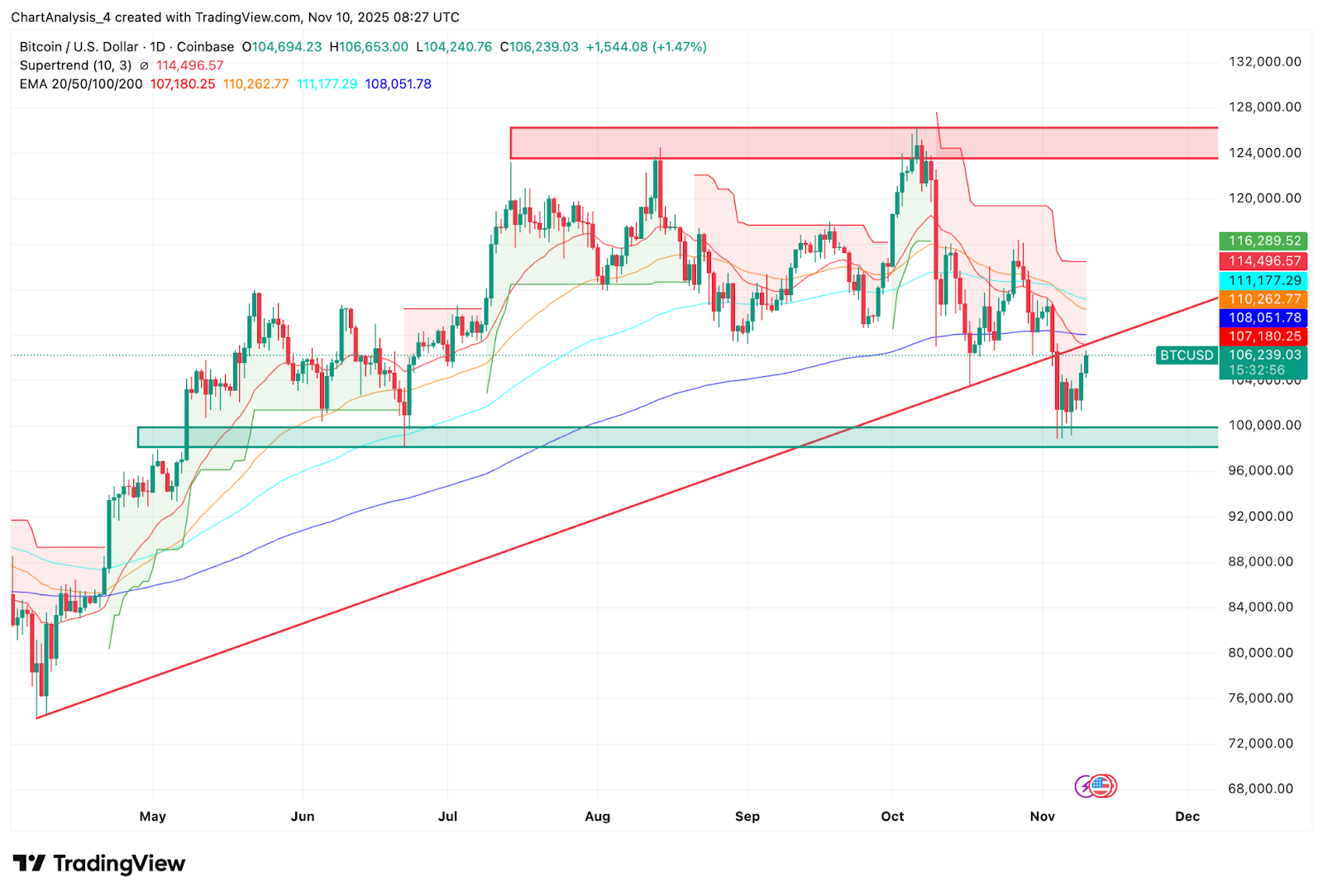 比特币价格今日在 106,239 美元附近交易,从上周跌破支撑整个 2025 年涨势的持续数月上升趋势线后有所反弹。卖方将价格推至 100,000 美元至 98,500 美元的需求区,买方在该价位附近进行了积极防守。唐纳德·特朗普的最新言论暗示美国政府停摆可能很快结束,这提振了市场风险情绪。