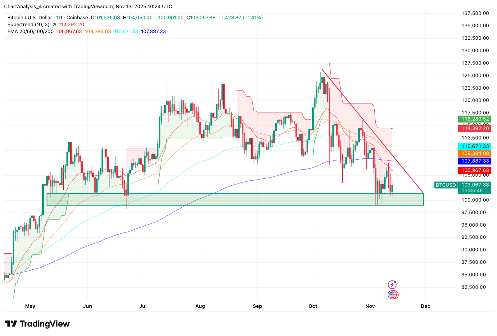 第一个阻力位目前位于 20 日均线附近,约为 105,900 美元,其次是 109,300 美元和 110,600 美元,50 日均线和 100 日均线在此交汇。超级趋势阻力位更高,位于 114,400 美元,这是趋势反转的关键门槛。如果日线收盘价高于这些移动平均线,则将确认买方力量的回归。如果价格未能守住 101,000 美元上方,则可能再次下探至 98,000 美元附近的下行区间,从而暴露出 95,000 美元附近的更深支撑位。