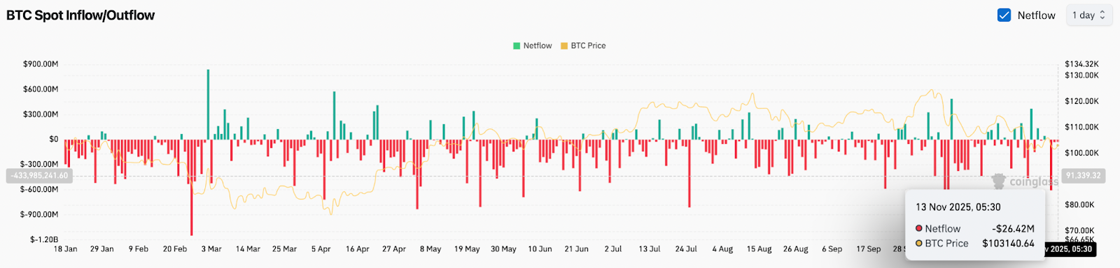 Coinglass数据显示,11月13日比特币交易所净流出资金达2640万美元。此前数日,由于宏观经济形势不明朗,交易者减少了持仓,导致市场参与度下降,此次持续的资金流出正是在此背景下发生的。持续的资金流出反映出短期交易者的信心不足,而长期钱包则保持稳定。