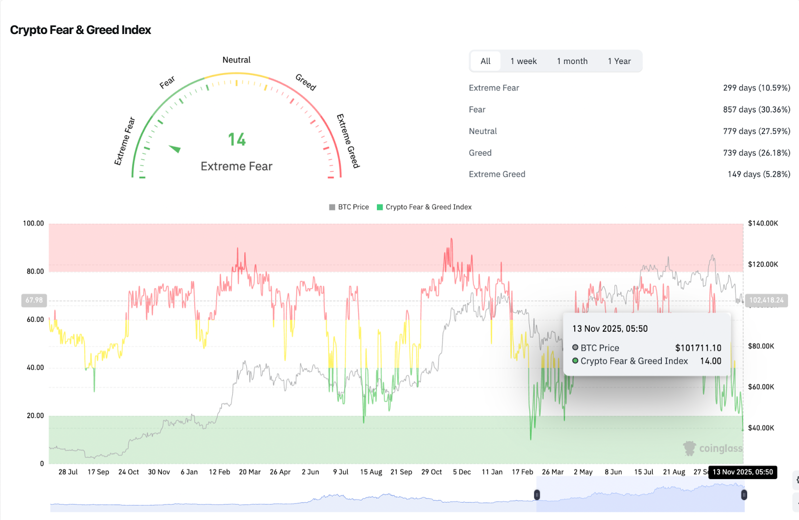 加密货币恐慌与贪婪指数已跌至14,创下3月以来的最低水平,表明整个市场处于“极度恐慌”状态。这种水平通常与局部底部相吻合,但也凸显了市场缺乏推动强劲反弹的信心。交易员似乎不愿投入新的资金,直到价格确认有效突破自9月以来一直限制价格走势的下跌结构。