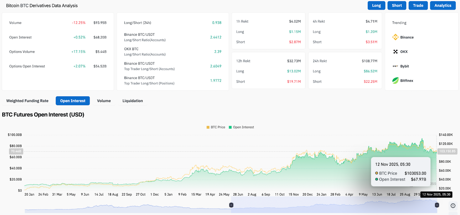 衍生品数据显示,交易者的行为发生了微妙但意义重大的转变。未平仓合约总额增长0.52%至682亿美元,而期货交易量下降12.25%至939.5亿美元。