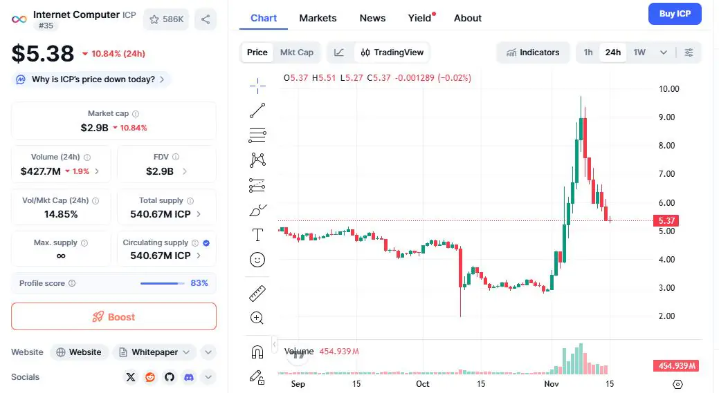 ICP 位于11月15日,价格区间为5.30美元至5.60美元。随着链上人工智能话题的升温,交易员们又开始关注它了。