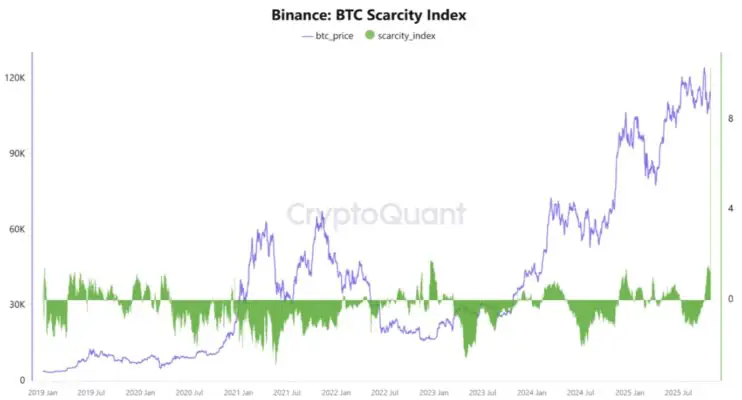 来自阿拉伯链的数据显示,币安比特币稀缺指数在10月份持续上升,此前10月下旬急剧飙升至9以上这是多年来的最高水平。