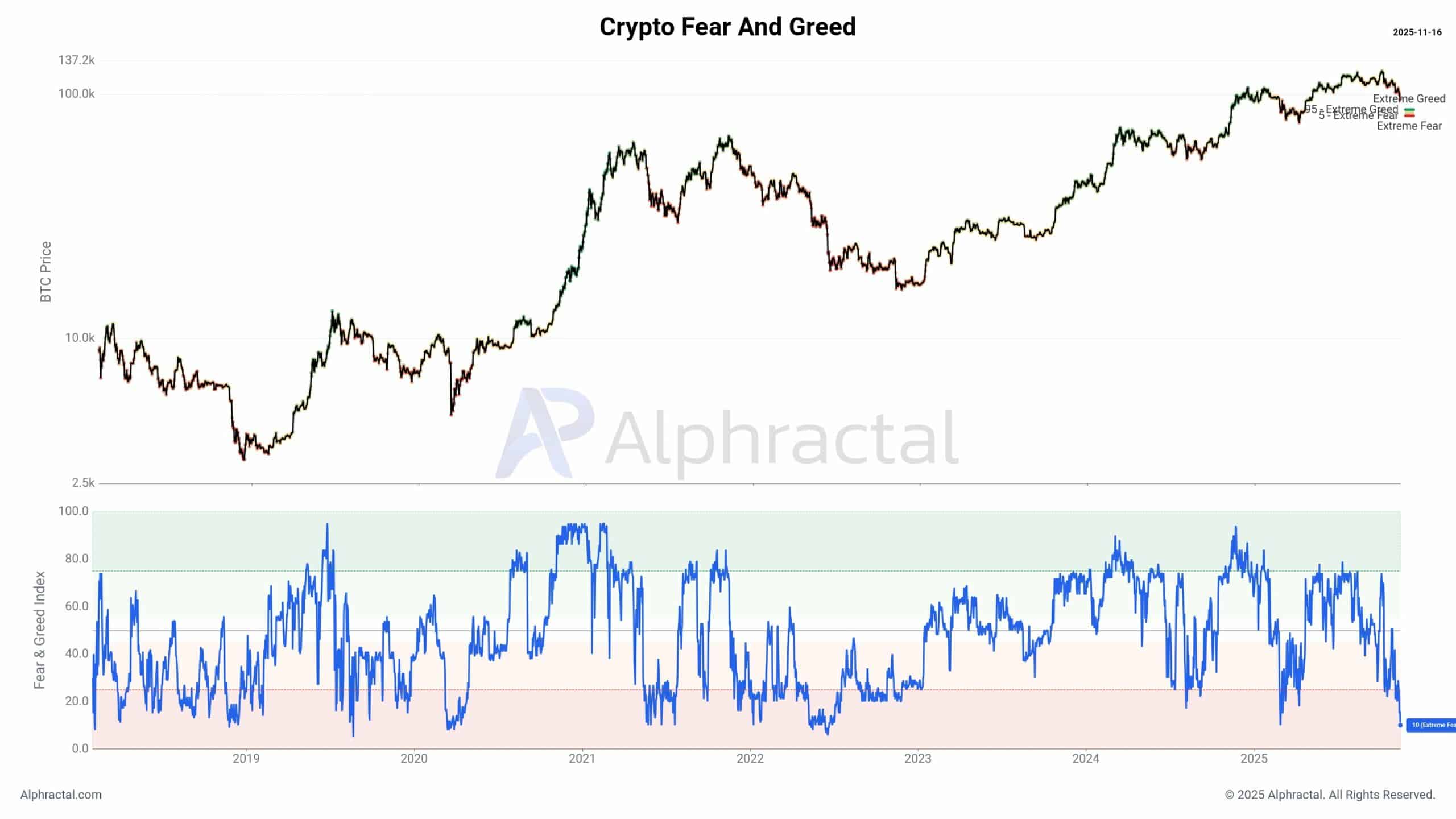 因为恐惧与贪婪指数已降至 10,这是 2025 年以来的最低读数。