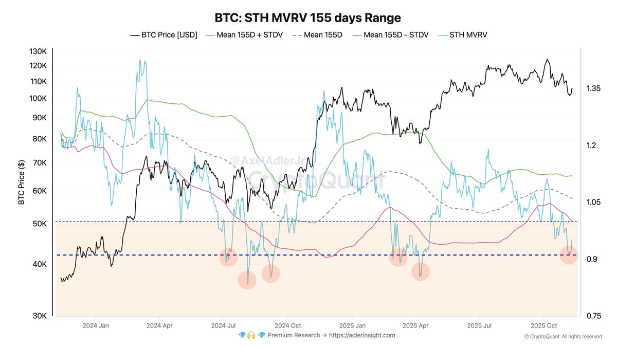 顶级分析师阿克塞尔·阿德勒亮点比特币短期持有者 (STH) MVRV 比率在经历了上周的大幅回调后,已初步显现复苏迹象。11 月 7 日,该指标触及 0.9124 的局部低点,接近其历史区间的下限——这一区域通常与短期市场底部相吻合。