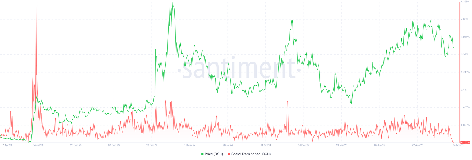 Santiment 发布的 BCH 社交主导度指标凸显了其看跌前景。该指数衡量的是 BCH 相关讨论在社交媒体上的占比。加密货币媒体报道称,比特币现金价格已从10月25日的0.76%跌至周二的0.15%,创下年内最低水平,也是自2023年7月以来的最低水平。这一跌幅表明投资者对比特币现金的兴趣减弱,社区参与度也随之降低。
