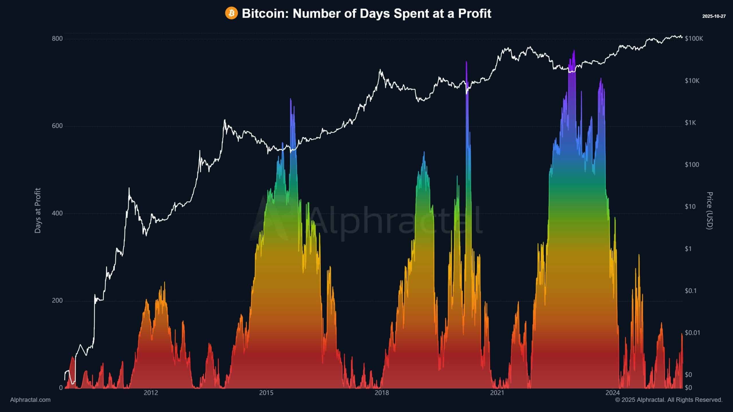 数据来自 Alpharactal节目比特币在近一年的时间里价格一直保持在 10 万美元以上,且跌幅很小,这是比特币历史上持续时间最长的盈利期。