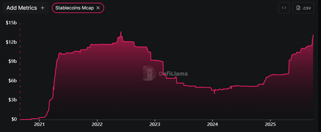 DefiLlama 数据显示,BNB 稳定币市值目前达到 132.2 亿美元,创历史新高,并且自 2025 年初以来稳步上升。BNB 项目的稳定币活跃度和价值增长表明市场看涨。前景因为它可以提高网络使用率,并能吸引更多用户加入生态系统,这得益于去中心化金融 (DeFi)、模因币和支付用例的推动。