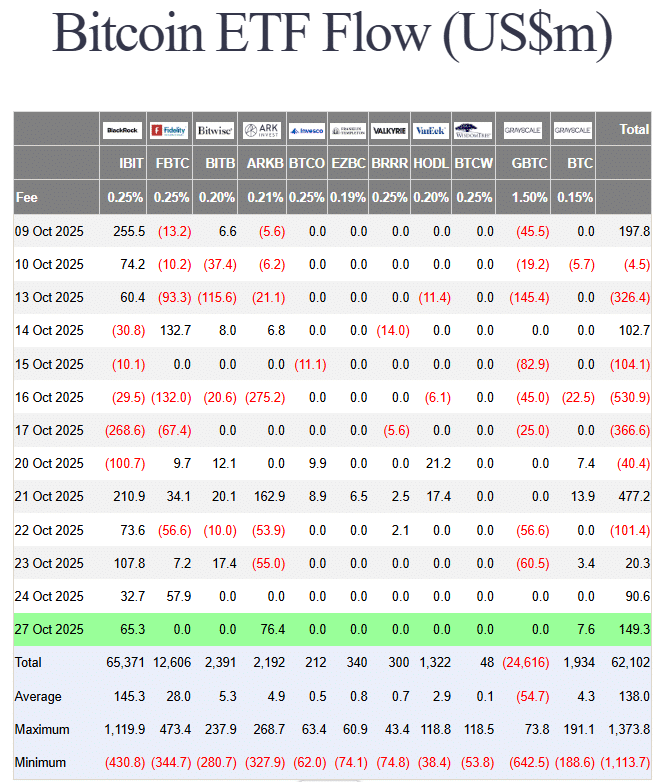 10月27日,美国比特币现货交易所交易基金(ETF)流入资金1.493亿美元。虽然流入金额相对较小,但表明短期市场情绪并非完全看跌。