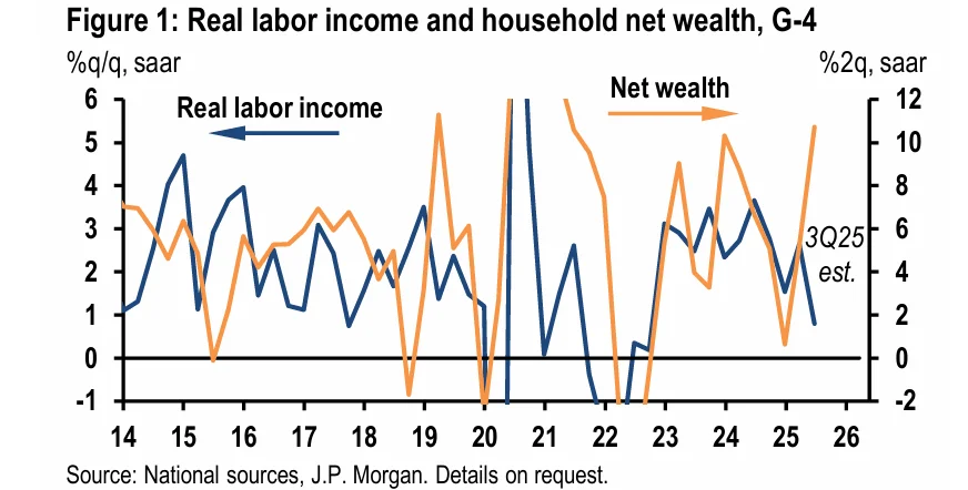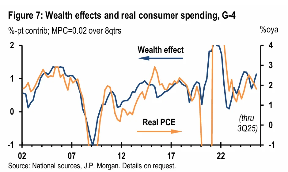 摩根大通认为,由股价上涨带来的“财富效应”正充当着一座桥梁,暂时弥补了劳动收入增长放缓带来的缺口。然而,分析师们也强调,这种由资产价格驱动的消费韧性难以长期持续。他们警告,一旦财富效应减弱,股市可能从经济的“缓冲垫”迅速转变为加剧下行压力的“放大器”。