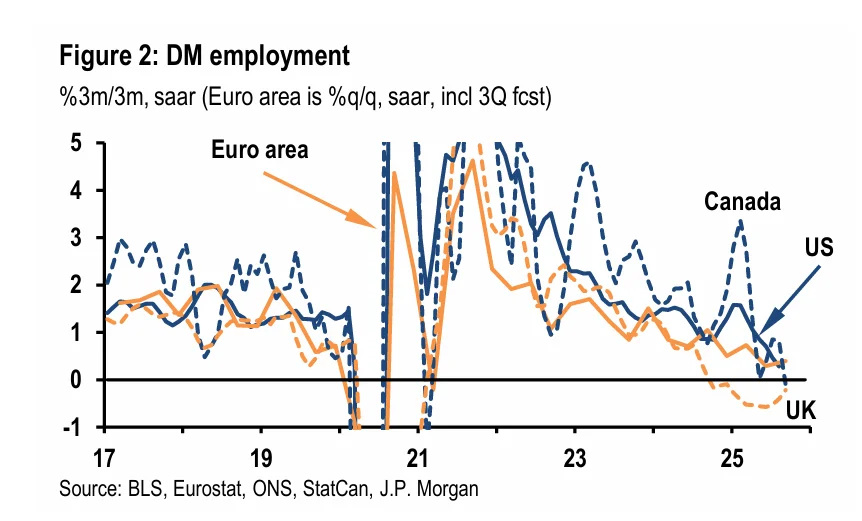 摩根大通的报告详细描述了劳动力市场疲软与消费市场火热之间的巨大鸿沟。数据显示,发达市场的就业增长已显著放缓,G4集团(美国、欧元区、英国、日本)的就业增速在2025年第三季度已接近停滞,降至0.3%的年化增长率。与此同时,实际劳动收入的增长也步履维艰。