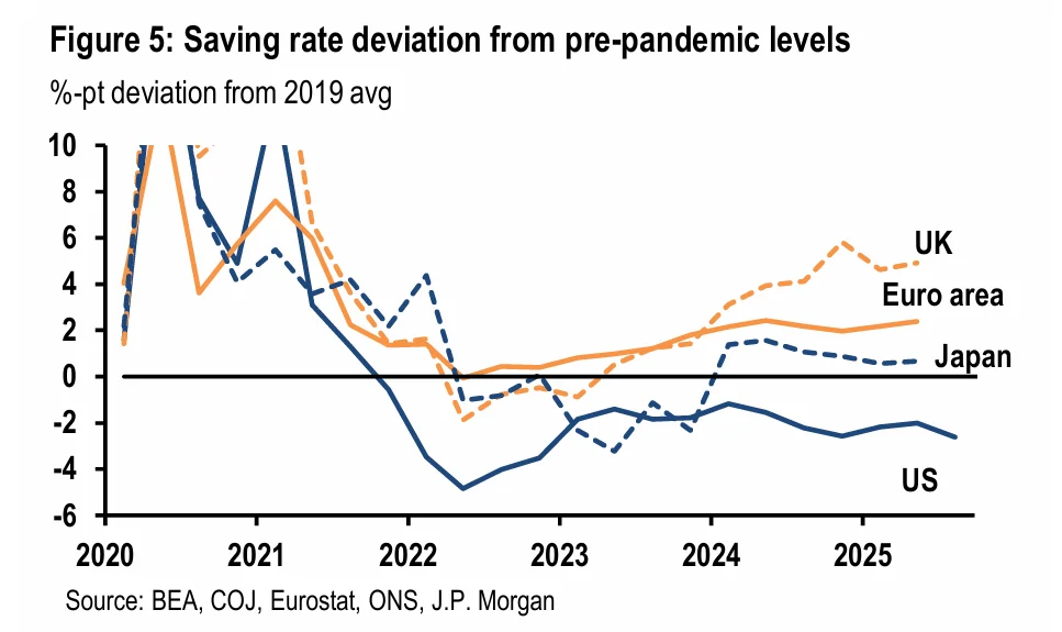 美国经济陷入“反身性”闭环:企业降本推高股价,财富效应刺激消费,消费再支撑业绩。然而摩根大通警告,这种由资产价格驱动的韧性不可持续。储蓄率下滑、收入预期疲弱,使消费动力趋弱。一旦股市回落,当前的“缓冲垫”可能迅速反转为加剧经济下行的“放大器”。