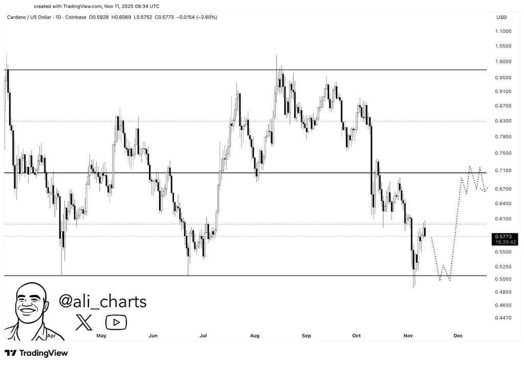 在2025年10月11日的加密货币崩盘中,该支撑区间被突破。此后,ADA价格每周持续走弱。加密货币分析师阿里·马丁内斯(Ali Martinez)认为,ADA价格必须守住0.51美元附近的最后防线,才能确认反弹至0.7美元。