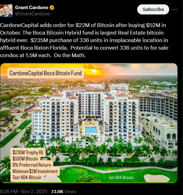 总部位于佛罗里达州的房地产投资公司Cardone Capital增加了其在以下领域的投资:比特币 [BTC]其创始人格兰特·卡多内宣布该基金在 10 月和 11 月期间增持了价值 7200 万美元的比特币。